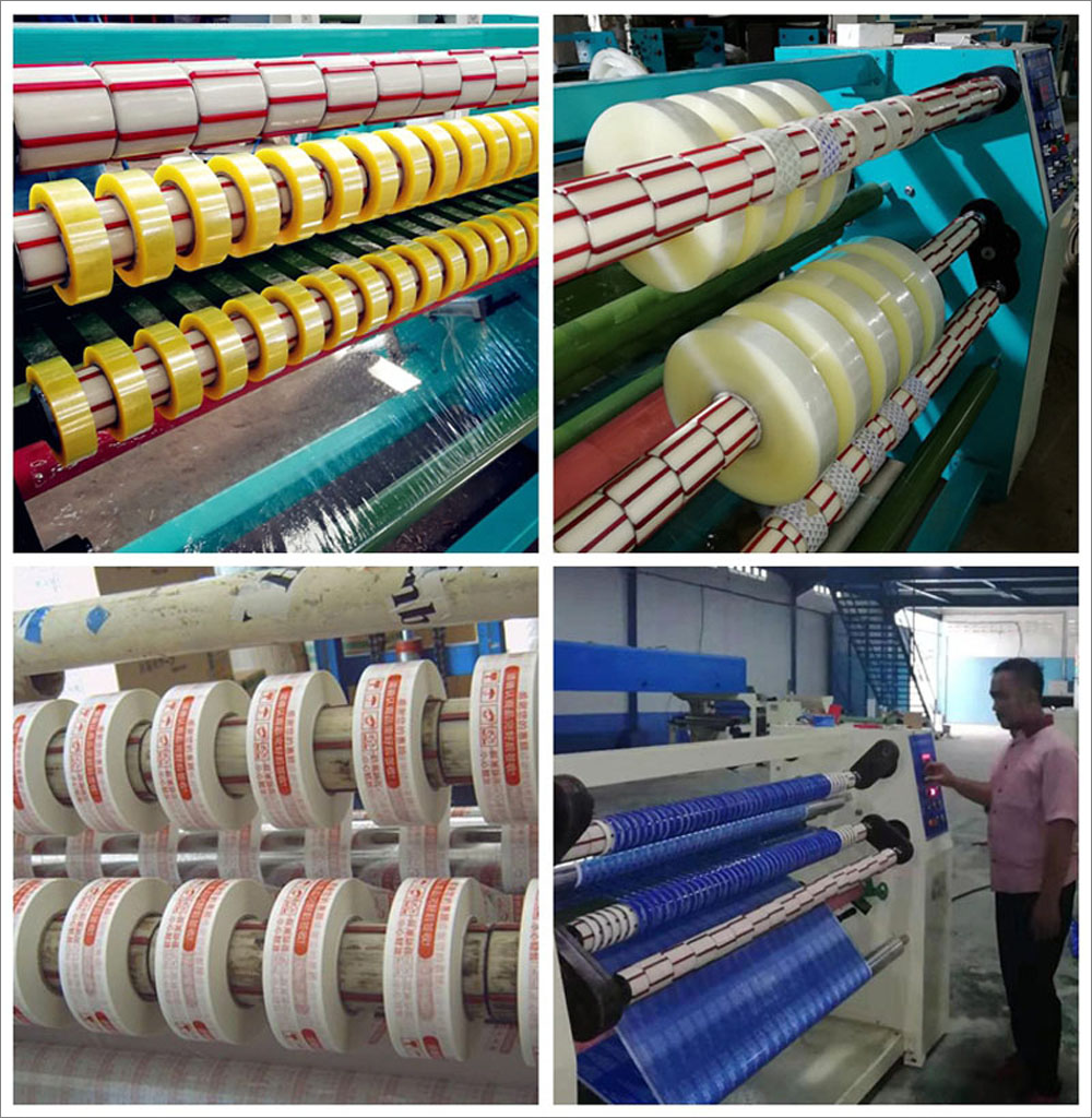 適用范圍:適用于各類透明封箱膠帶、印字印刷封箱膠帶半成品母卷的分條加工