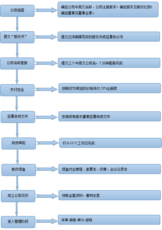 | 辦理香港公司注冊的程序如下: (一)擬定好香港公司的中英文名稱,注冊股本(不用驗資,沒有上限),業務性質及各股東股份分配比 例(公司中文名需以“有限公司”結尾,英文名需以“LIMITED”全寫結尾,注冊股本最低為10000港幣, 業務性質中英文不混合,中文不超過28個漢字,英文不超過60個字母); (二)提交香港公司中英文名稱給我公司查詢,若無重名情況,即可使用; (三)簽署注冊香港公司委托書,協議書; (四)預付50%注冊定金, (五)股東董事簽署相關政府法定文檔,主要包括NC1法團成立表格,出任股東董事,第一次董事會議記 錄及公司章程,開戶證明等,并將簽署后的原件快遞到我公司; (六)收到快遞后我公司交香港政府辦理,正常8-10個工作日辦理完成; (七)繳付注冊香港公司尾款,領取香港公司全套資料。